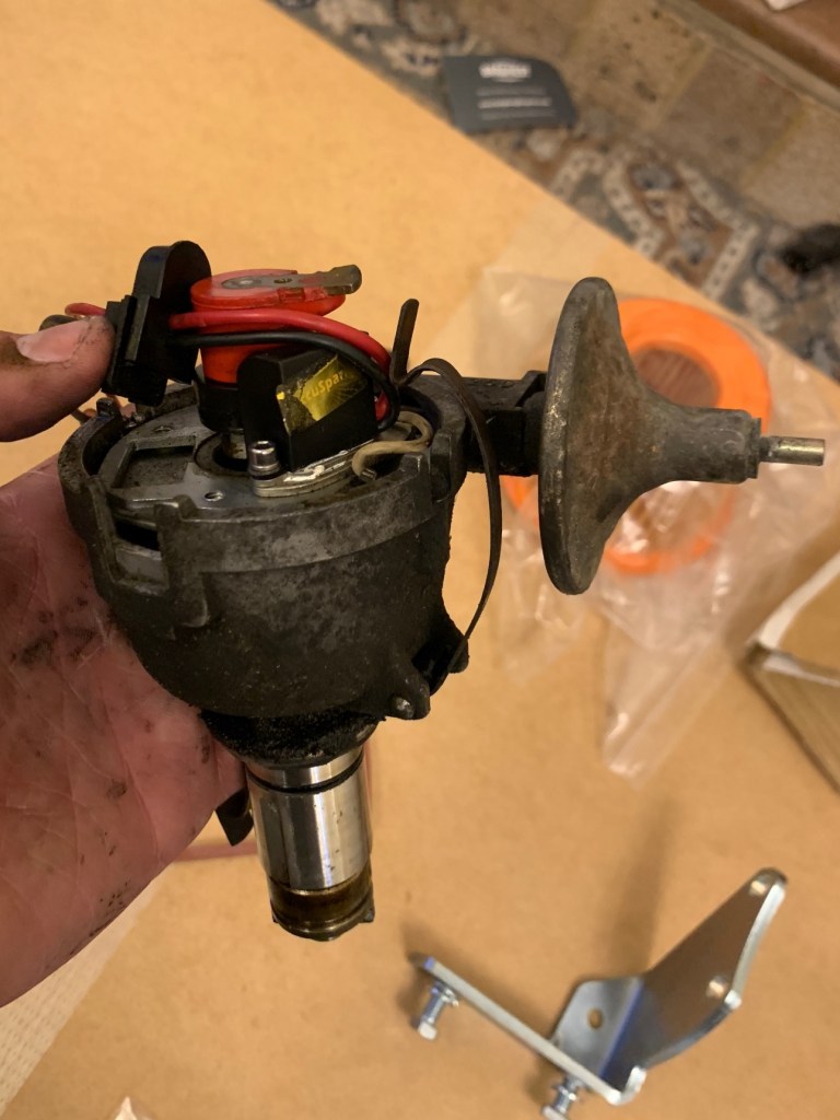 For a while I even considered that I might’ve purchased the incorrect distributor, but the actual problem was something easily solved; The clamping plate that locks the distributor in position had been over-tightened and bent at some point, not leaving a large enough hole for the distributor unit to be fitted into.