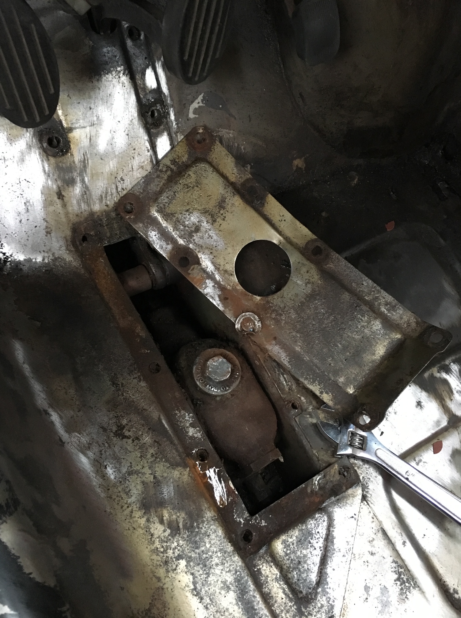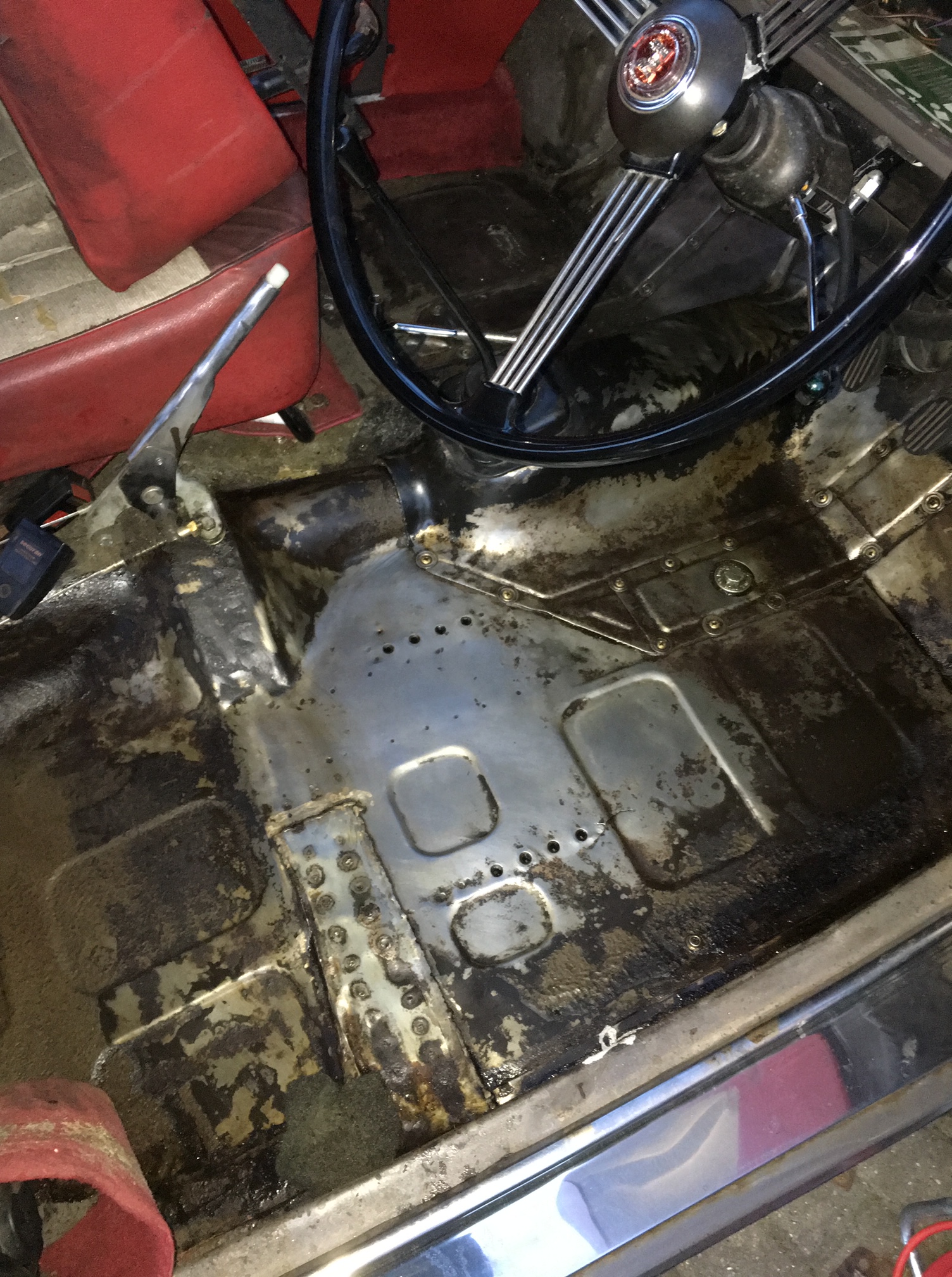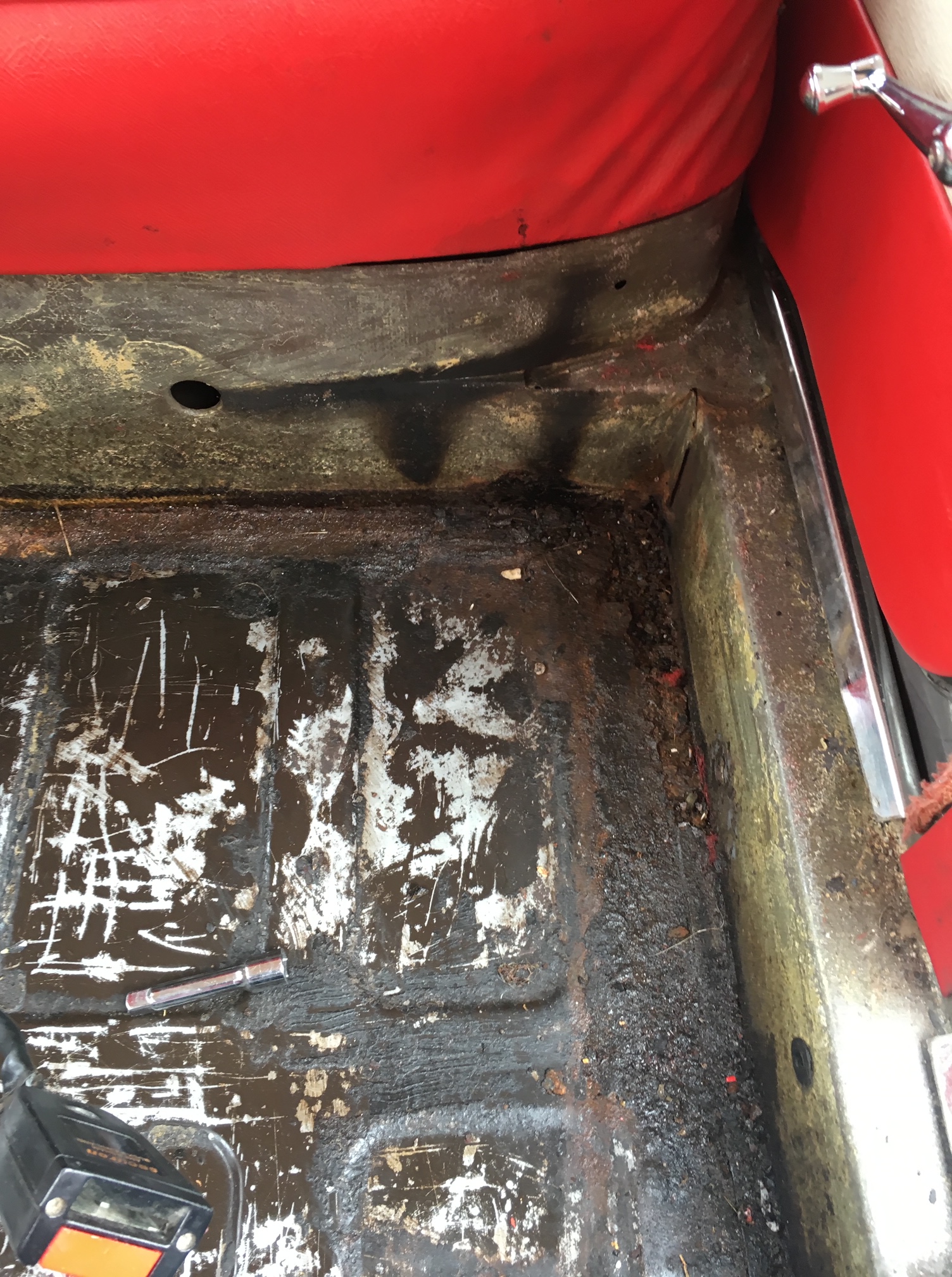 Drivers side floor. Note the previous repairs to the crossmember.