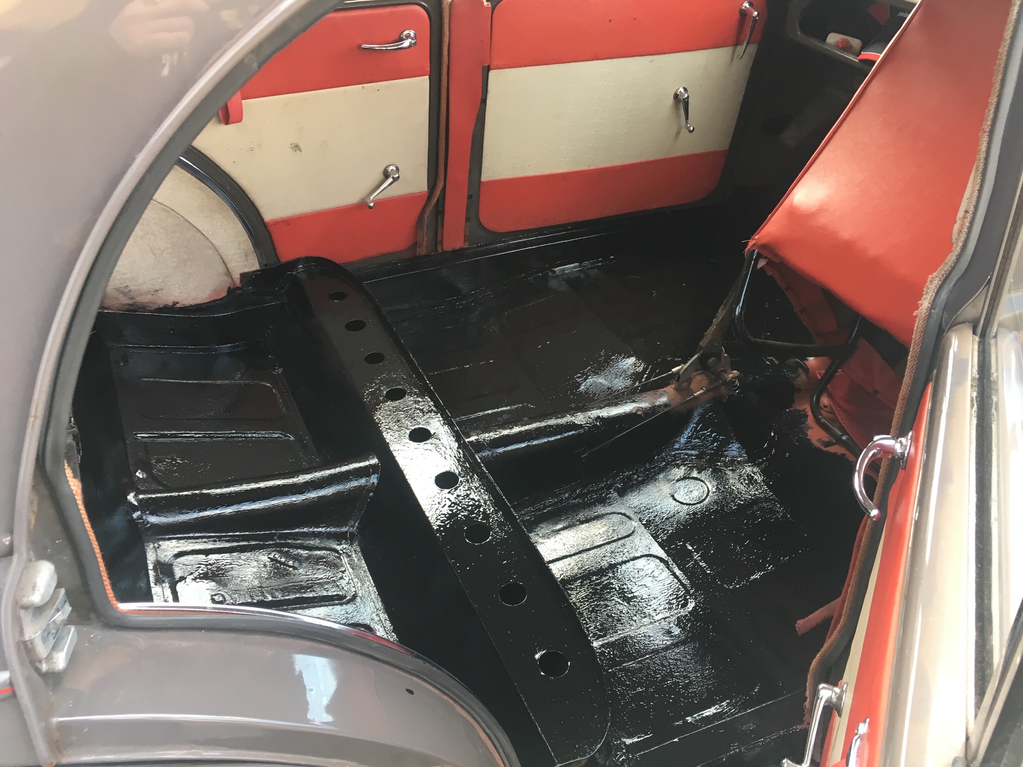 When I got the car back, the inside floor surfaces had been treated with a coat of red oxide paint, which I went over this with a product called Epoxy Mastic 121, which is described as a “two-pack high build primer/finish which can be used on Steel, Aluminium, Galvanised Metal and GRP”.