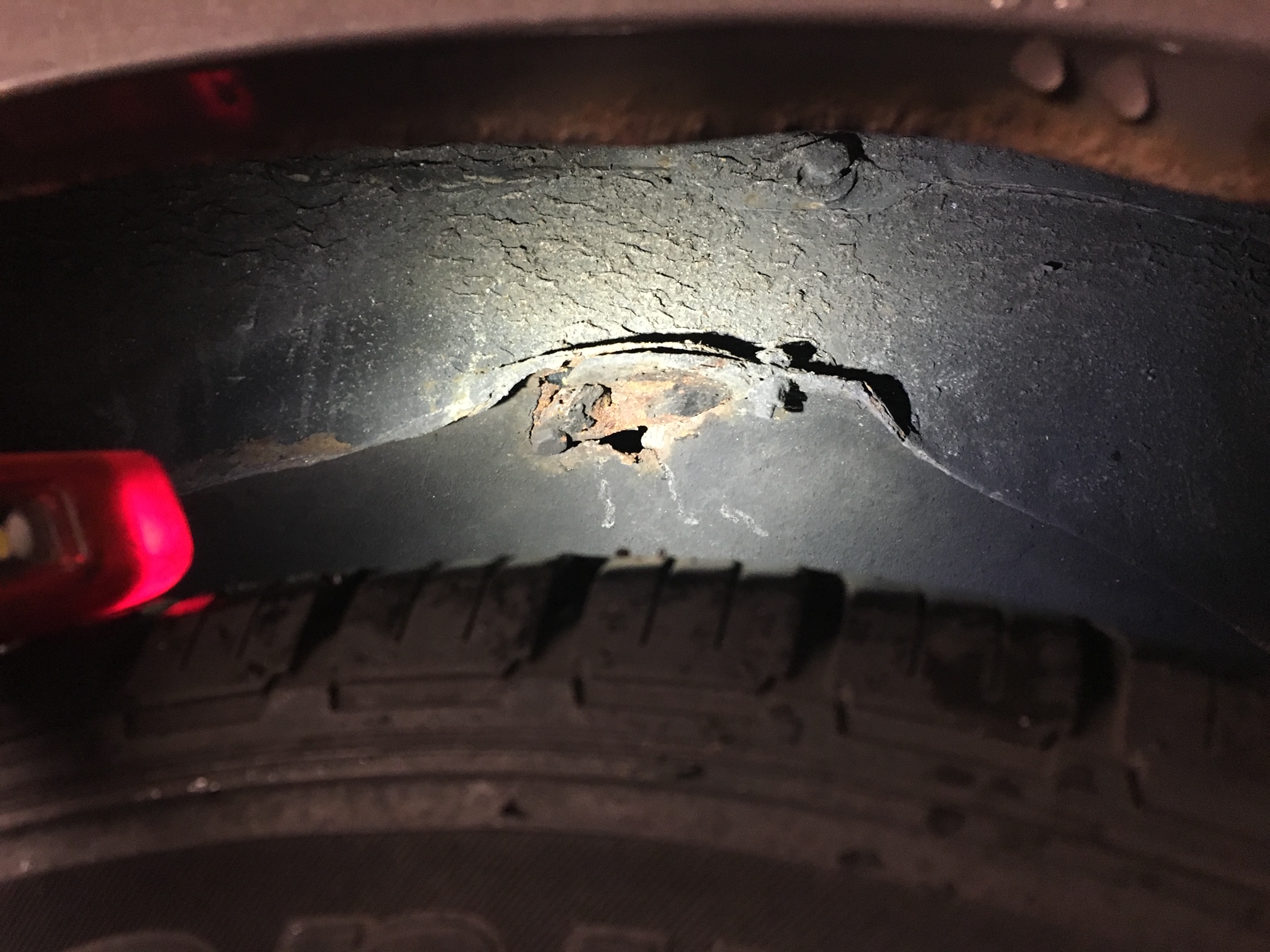 The inside of the driver’s side front wheel arch – in this image you can see the remnants of where the rubber bump-stop should be – I didn’t know about this at the time and the garage simply plated-over the hole.The rear of the car hadn’t fared much better! (Photo from passenger side)