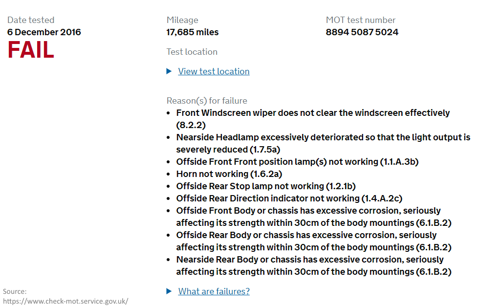 On 6th December 2016 the car failed an MOT for a number of reasons. A fair few issues on the car were relating to the state of the underneath, or the lack of an underneath in some places!
