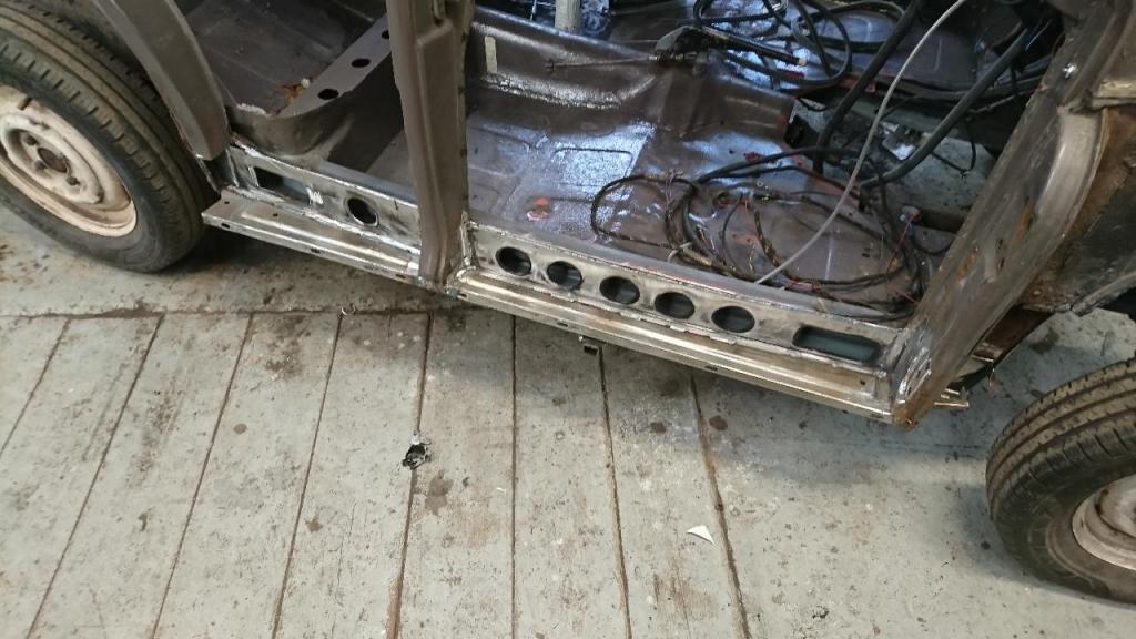 Looking downward at the new bootwell panel – this lower area constantly pooled with water and had deteriorated quite badly, especially in the corners. The sills, inner wings, and door pillars with a new coat of paint.It’s all coming together!